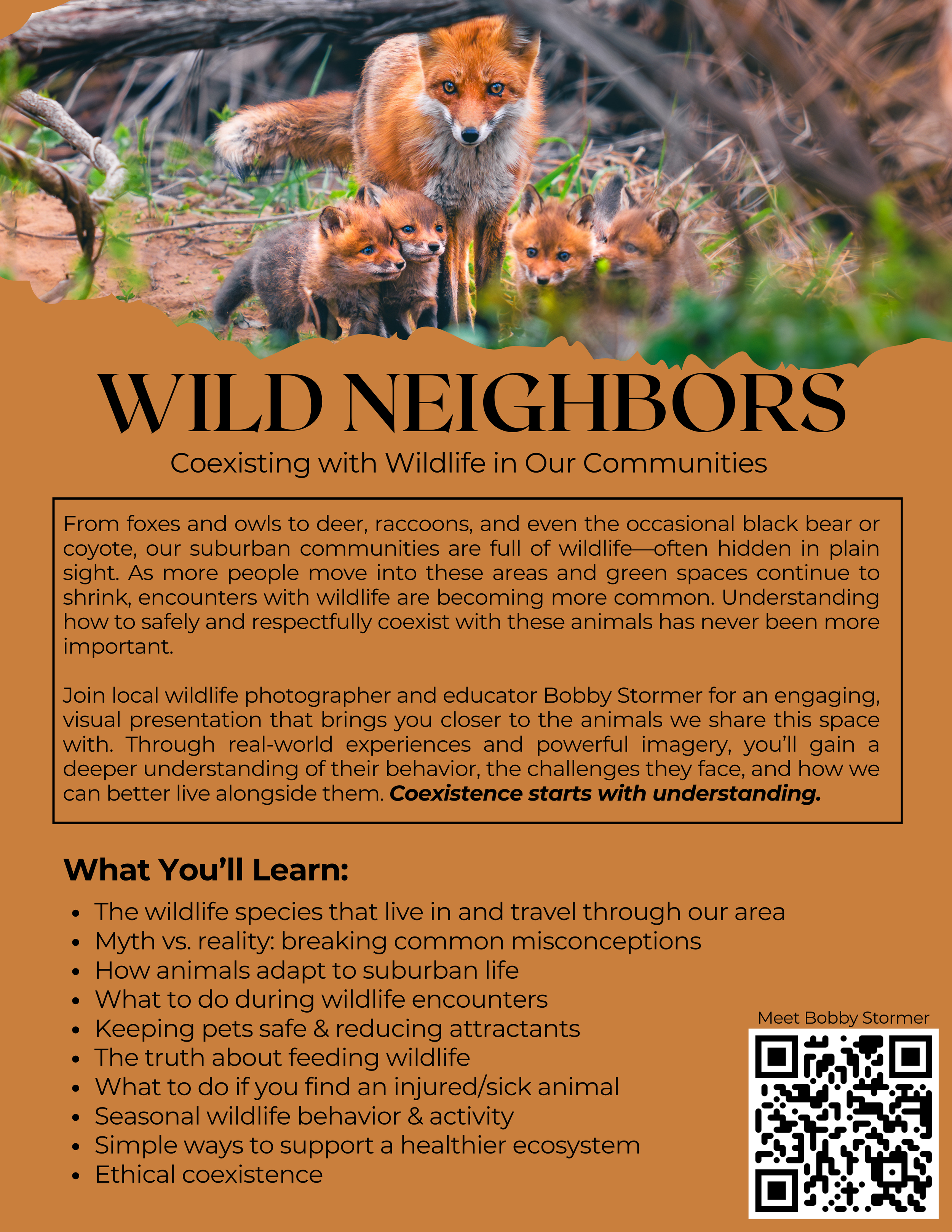 In this engaging and visual presentation, local wildlife photographer and educator Bobby Stormer uses powerful imagery and real-world experiences to introduce residents to the animals that call this area home. Designed for both adults and children, this program helps build a deeper understanding of wildlife behavior, challenges common misconceptions, and provides practical guidance for safely and respectfully coexisting with the natural world around us.